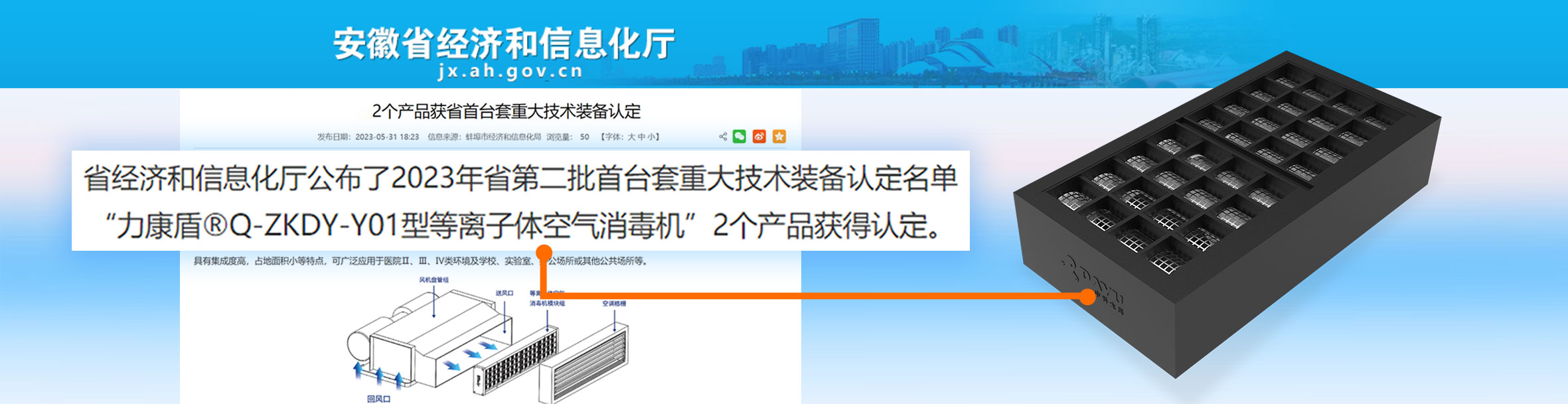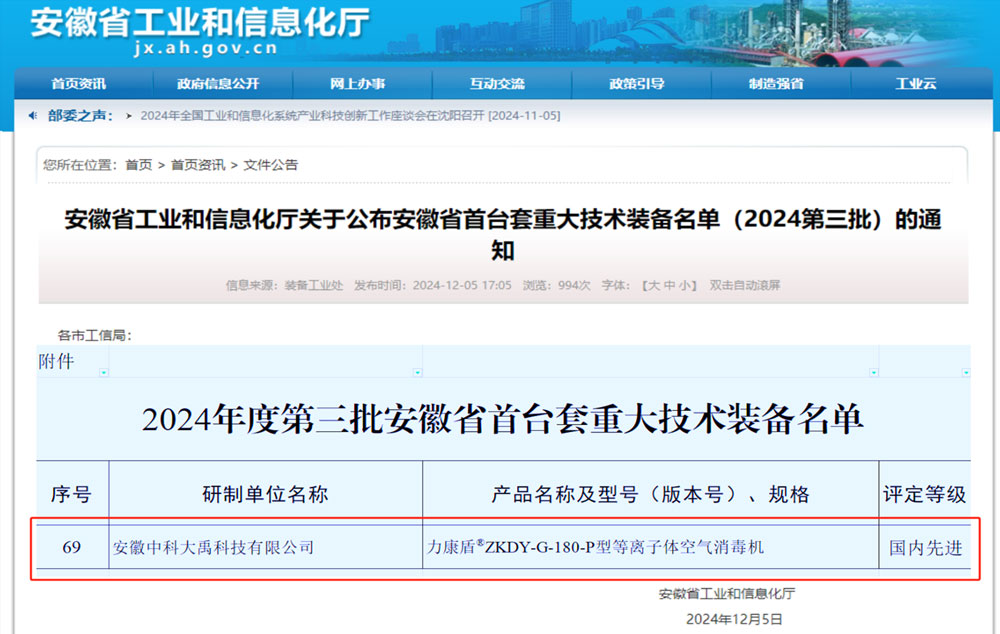 力康盾?ZKDY-G-180-P型等離子體空氣消毒機(jī)入選2024年度第三批安徽省首臺套重大技術(shù)裝備,評定等級:國內(nèi)先進(jìn)